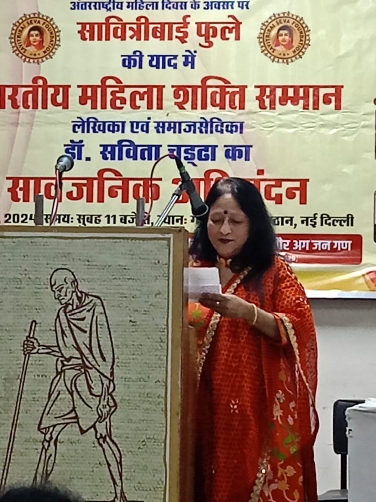 सावित्री बाई सेवा फाउंडेशन पुणे, अंग जन गण और मेरा गांव मेरा देश फाउंडेशन द्वारा लेखक व कवि अतुल प्रभाकर की अध्यक्षता में देश के अनेक राज्यों से विभिन्न विधाओं में ख्यातिरत तीस महिलाओ को ‘भारतीय महिला शक्ति सम्मान-2024’ से नवाजा गया। लेखिका समाज सेविका डॉक्टर सविता चड्ढा का सार्वजनिक अभिनन्दन किया गया। उक्त प्रतिष्ठित सम्मान से सम्मानित होने वालों में उत्तराखण्ड की सु-विख्यात शास्त्रीय गायिका मधु बेरिया साह व सुप्रसिद्ध साहित्यकारा डॉक्टर पुष्पा जोशी को भी उक्त राष्ट्रीय सम्मान से नवाजा गया।
