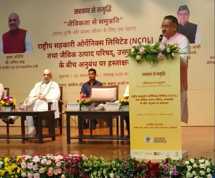 नई दिल्ली,30 अगस्त। प्रदेश के कृषि मंत्री गणेश जोशी ने नई दिल्ली में उत्तराखण्ड जैविक उत्पाद परिषद द्वारा आयोजित राष्ट्रीय सहकारी ऑर्गेनिक लिमिटेड एवं उत्तराखंड जैविक उत्पाद परिषद के बीच अनुबंध पर हस्ताक्षर कार्यक्रम में प्रतिभाग किया गया। कार्यक्रम में बतौर मुख्य अतिथि केंद्रीय गृह एवं सहकारिता मंत्री अमित शाह की उपस्थिति में सहकारिता मंत्रालय के अधीन स्थापित नेशनल कोआपरेटिव आर्गेनिक लिमिटेड (एनसीओएल) और उत्तराखण्ड जैविक उत्पाद परिषद ( उत्तराखंड सरकार) के साथ एमओयू साइन किया गया। राष्ट्रीय सहकारी ऑर्गेनिक लिमिटेड एवं उत्तराखंड जैविक उत्पाद परिषद के बीच हुआ अनुबंध में -जैविक खेती करने वाले किसानों को एक मंच मिलेगा, जैविक उत्पादों को बाजार उपलब्ध होगा, बाजार पहुंच का विस्तार होगा, जैविक उत्पादन और विपणन प्रयासों में सुधार होगा औरकिसानों की आय में वृद्धि होगी। इसमें राष्ट्रीय सहकारी ऑर्गेनिक लिमिटेड जैविक उत्पाद परिषद उत्तराखंड का पूर्ण सहयोग करेगा।