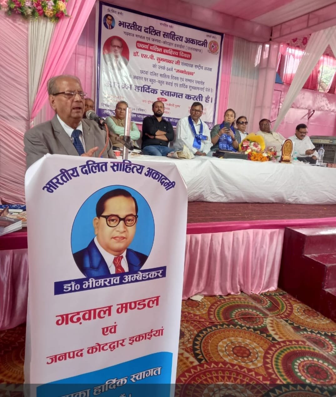 कोटद्वार – आज दिनांक 6 अक्टूबर2024 को गढ़वाल के प्रवेशद्वार कोटद्वार में भारतीय दलित साहित्य अकादमी गढ़वाल मंडल एवम् कोटद्वार जिला इकाई के तत्वाधान में नजीबाबाद रोड स्थित महाराजा वैडिंग प्वाइंट में अकादमी के राष्ट्रीय अध्यक्ष *डॉक्टर एस पी सुमनाक्षर का 84 वाँ जन्मदिवस दलित साहित्य दिवस* के रूप में हर्षोल्लास के साथ मनाया गया, बतौर मुख्य अतिथि कार्यक्रम को संबोधित करते हुए लैंसीडाउन विधायक महंत दलीप रावत ने अपने संबोधन में कहा की दलित समाज ही सनातन धर्म की बुनियाद है ,अगर सनातन धर्म से दलित वर्ग निकल गया तो सनातन धर्म को बचाया नही जा सकता है, उन्होंने भारी संख्या में दलितों के धर्मांतरण पर चिंता व्यक्त करते हुए आहवान किया की दलित समाज को धर्मांतरण की बजाय अपनी ताकत को समझना होगा, उन्होंने दलित वर्ग के धर्मांतरण के लिए तथाकथित उच्च जातियों को भी जिम्मवार ठहराया जिन्होंने दलितों के सामने ऐसी परिस्थितियां पैदा की जिसकी वजह से सनातन धर्म की बुनियाद दलित वर्ग ने धर्मांतरण का रास्ता अपनाया।