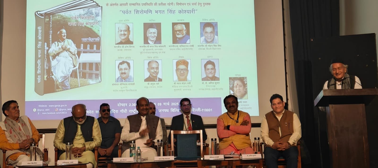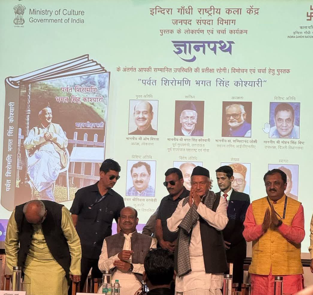 नई दिल्ली। इंदिरा गांधी राष्ट्रीय कला केंद्र के समवेत सभागार में 9 मार्च को वरिष्ठ पत्रकार मदन मोहन सती द्वारा रचित पुस्तक ‘पर्वत शिरोमणि भगत सिंह कोश्यारी’ का भव्य विमोचन मुख्य अतिथि लोकसभा अध्यक्ष ओम बिरला तथा विशिष्ट अतिथि दिल्ली विधानसभा उपाध्यक्ष मोहन सिंह बिष्ट तथा केंद्रीय संस्कृत विश्वविद्यालय कुलपति, प्रो.श्रीनिवास वरखेड़ी की प्रभावी उपस्थिति तथा उत्तराखंड के पूर्व मुख्यमंत्री एवं महाराष्ट्र व गोवा के पूर्व राज्यपाल भगत सिंह कोश्यारी के सानिध्य, प्रो.के अनिल कुमार विभागाध्यक्ष जनसंपदा आईजीएनसीए तथा कार्यक्रम अध्यक्षता कर रहे आईजीएनसीए सदस्य सचिव सच्चिदानंद जोशी के कर कमलों किया गया।