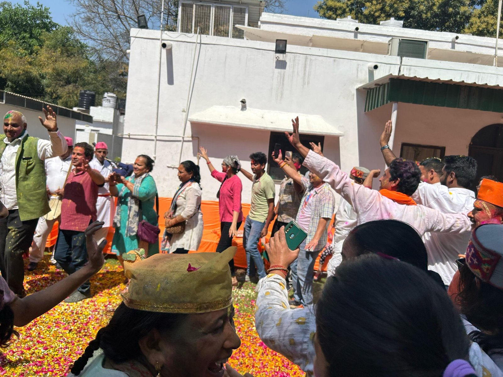 उत्तराखंड की होली पर ब्रज भाषा का प्रभाव सदियों से चला आया है वह प्रभाव इस आयोजन में भी देखने को मिला। .. काहे को तेरो रंग बना है, काहे कि है पिचकारी… होली है! गोल दायरे में हुल्यारे अपने पद संचालन कर रहे थे.. इतने में वादकों ने चैत की चैताली…. गाने को पांडवणृत्य की लय पर शुरू किया मानों सभी पांडव धरती पर उतर आए हों … रंग खेला जा रहा था सभी नर नारी उल्लासपूर्वक गाने के साथ नाचने लगे। ऐजा हे भानुमति पाबो बाजार… गढ़वाल मा बाघ लग्यूं च बाघ कि च डैर, प्वां बाघ रे… एक से बढ़कर एक गीत और नाच की तालों ने सब को नाचने के लिए विबस कर दिया। सांसद बलूनी और विधायक नेगी पूरे आयोजन का नृत्य करते हुए आनंद लेते रहे। बीच बीच में मिठाइयों और नमकीन का दौर भी चलता रहा।
