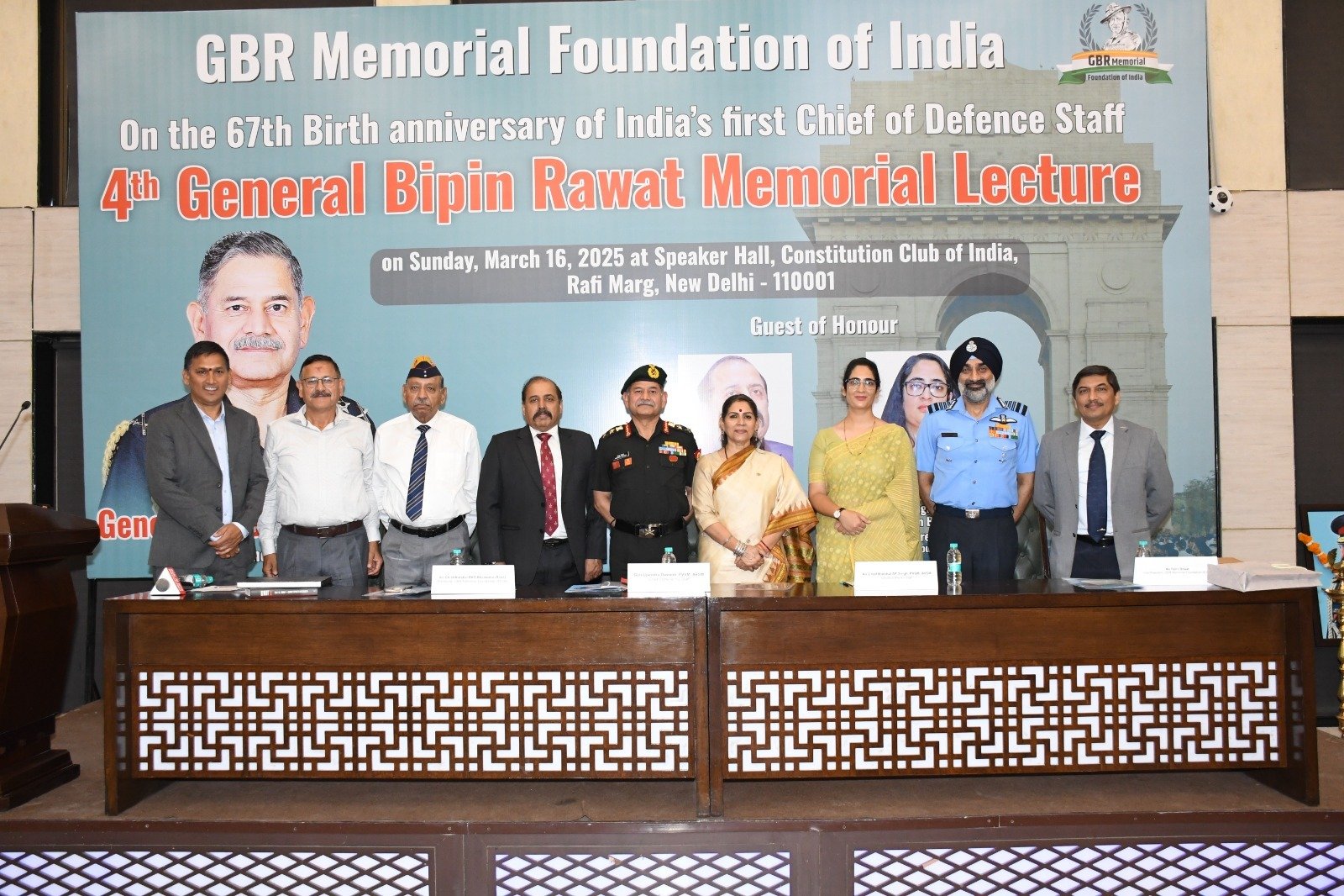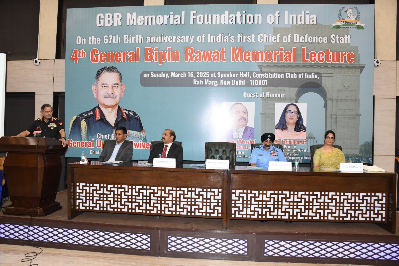 दिल्ली।दिल्ली के कांस्टीट्यूशन क्लब में जीबीआर फाउंडेशन ऑफ इंडिया ने देश के पहले सीडीएस जनरल बिपिन रावत की 67वीं जयंती पर चतुर्थ मैमोरियल लेक्चर का आयोजन किया गया। इस अवसर पर मुख्य अतिथि थलसेना प्रमुख उपेंद्र द्विवेदी, विशिष्ट अतिथि जीबीआर फाउंडेशन ऑफ इंडिया के अध्यक्ष एवं पूर्व वायुसेना प्रमुख आरकेएस भदौरिया, जनरल बिपिन रावत की सुपुत्री तारिणी रावत और आजतक के सीनियर एडिटर और वरिष्ठ रक्षा पत्रकार एवं फ़ाउंडेशन के सचिव मनजीत नेगी मुख्य वक्ता के रूप में उपस्थित रहे। इस कार्यक्रम में वायुसेना प्रमुख एपी सिंह समेत तीनों सेनाओं के अधिकारी, रक्षा सुरक्षा से अधिकारी शामिल हुए।