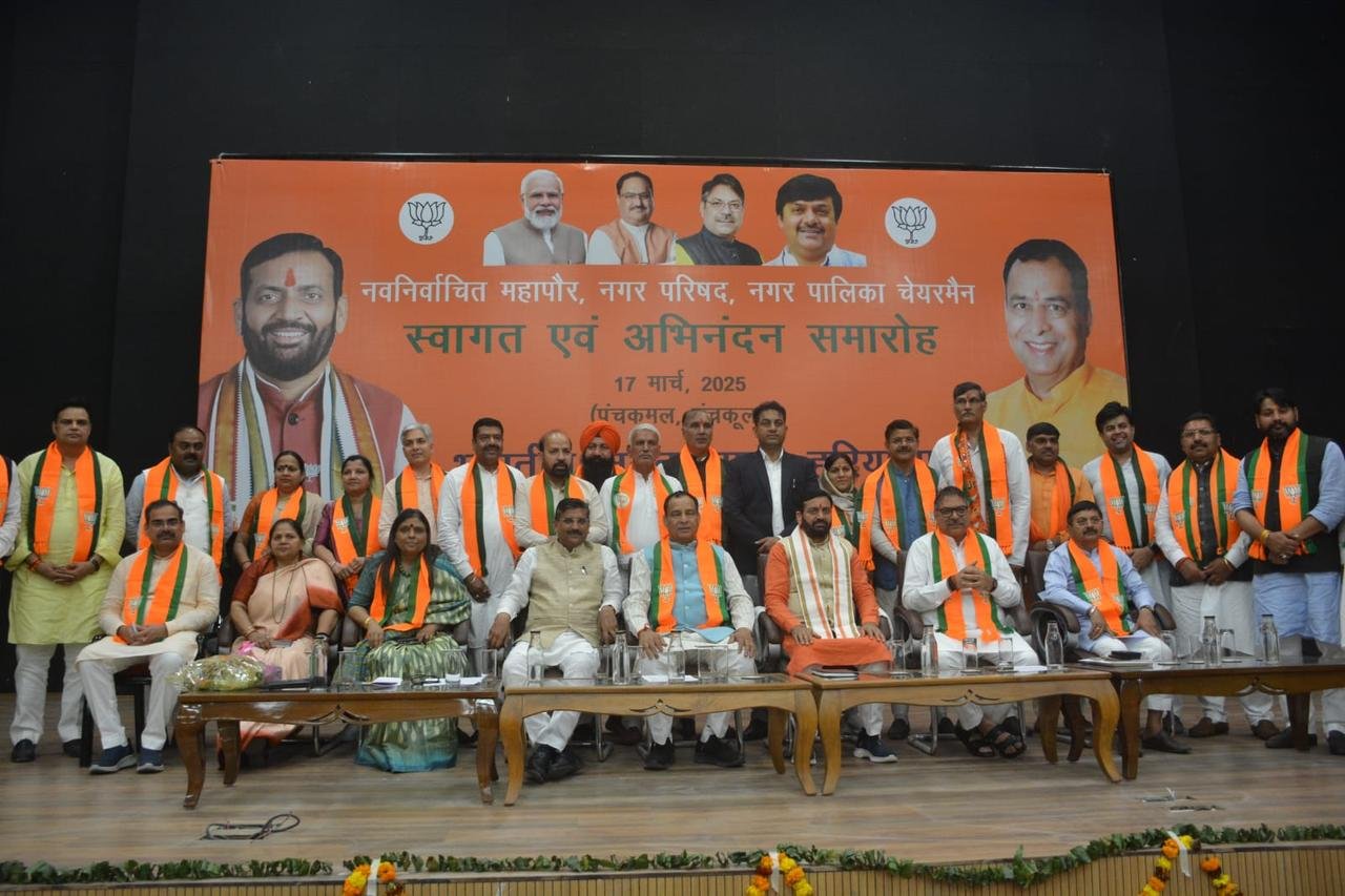 नई दिल्ली/ नगर निकाय चुनाव में मिली प्रचंड जीत से गदगद भारतीय जनता पार्टी ने सोमवार को पंचकूला स्थित पार्टी कार्यालय ‘‘पंचकमल’’ में भाजपा के नवनियुक्त जिला अध्यक्ष, नवनिर्वाचित मेयर, और चेयरमैनों का स्वागत और अभिनंदन समारोह का आयोजन किया। स्वागत और अभिनंदन समारोह में मुख्यमंत्री नायब सिंह सैनी, प्रदेश प्रभारी डा. सतीश पूनिया, भाजपा प्रदेश अध्यक्ष पंडित मोहन लाल बड़ौली, संगठन मंत्री फणीन्द्रनाथ शर्मा, प्रदेश महामंत्री सुरेंद्र पूनिया, डा. अर्चना गुप्ता, कैबिनेट मंत्री कृष्ण बेदी भी उपस्थित रहे। मुख्यमंत्री नायब सिंह सैनी ने नगर निकाय चुनाव में मिली जीत का श्रेय प्रदेश प्रभारी, प्रदेश अध्यक्ष और संगठन मंत्री सहित पूरी भाजपा टीम को दिया और जनता का भी आभार जताया तथा सभी नवनियुक्त जिला अध्यक्षों, नवनिर्वाचित मेयर और चेयरमैनों को जीत की बधाई दी। समारोह में तय किया गया कि 25 मार्च को नगर निकाय चुनाव में जीत कर आए सभी भाजपा पार्षदों और मेयर व चेयरमैनों का शपथ ग्रहण समारोह होगा।
